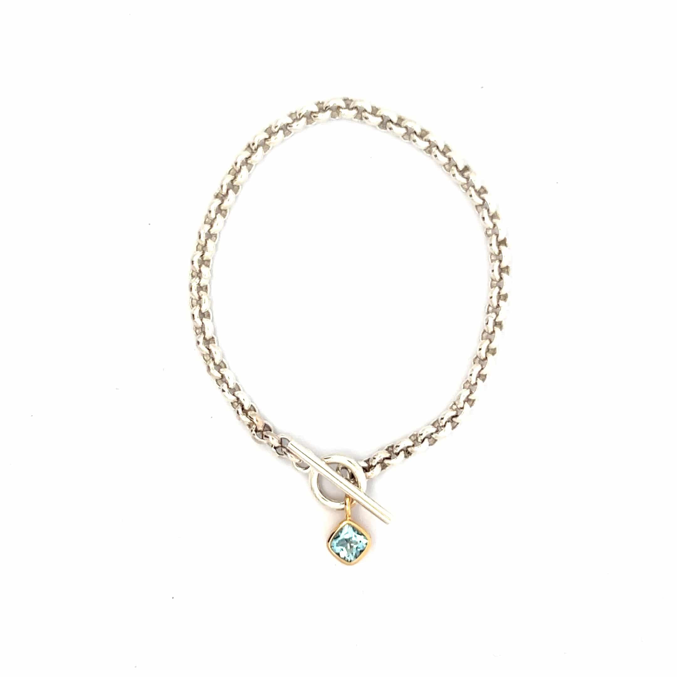 - Armband aus Silber mit einem Aquamarin in den Maßen 6 x 6 mm, gefasst in 18 Karat Gold.