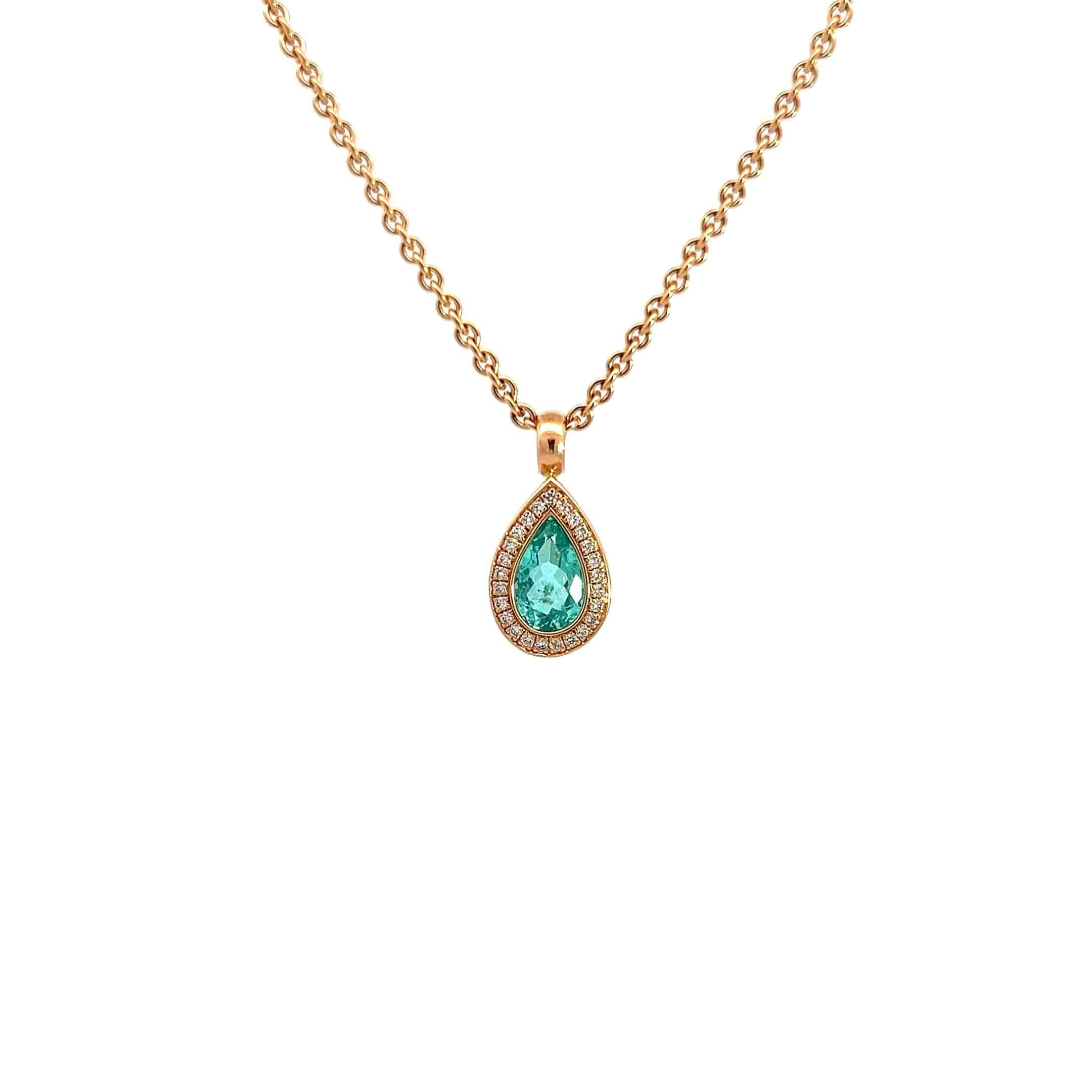 - Ankerkette 1,9 mm in 42 cm aus 18 Karat Roségold mit einem Paraiba Turmalin in Tropfenform aus Mosambik mit einem 8,9 x 6 mm 1,30 ct. und 28 Brillanten 1 mm FW/VS