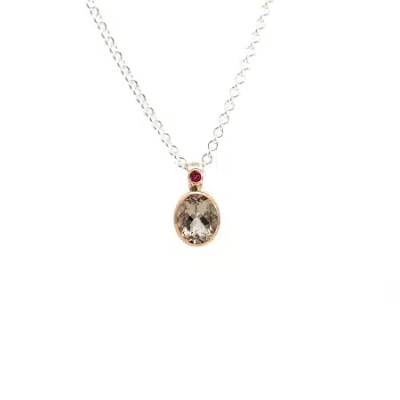 - Kette aus Silber mit einem Rauchquarz oval facettiert 11 x 9 mm und einem pinken Saphir 2 mm, gefasst in 18 Karat Gold.