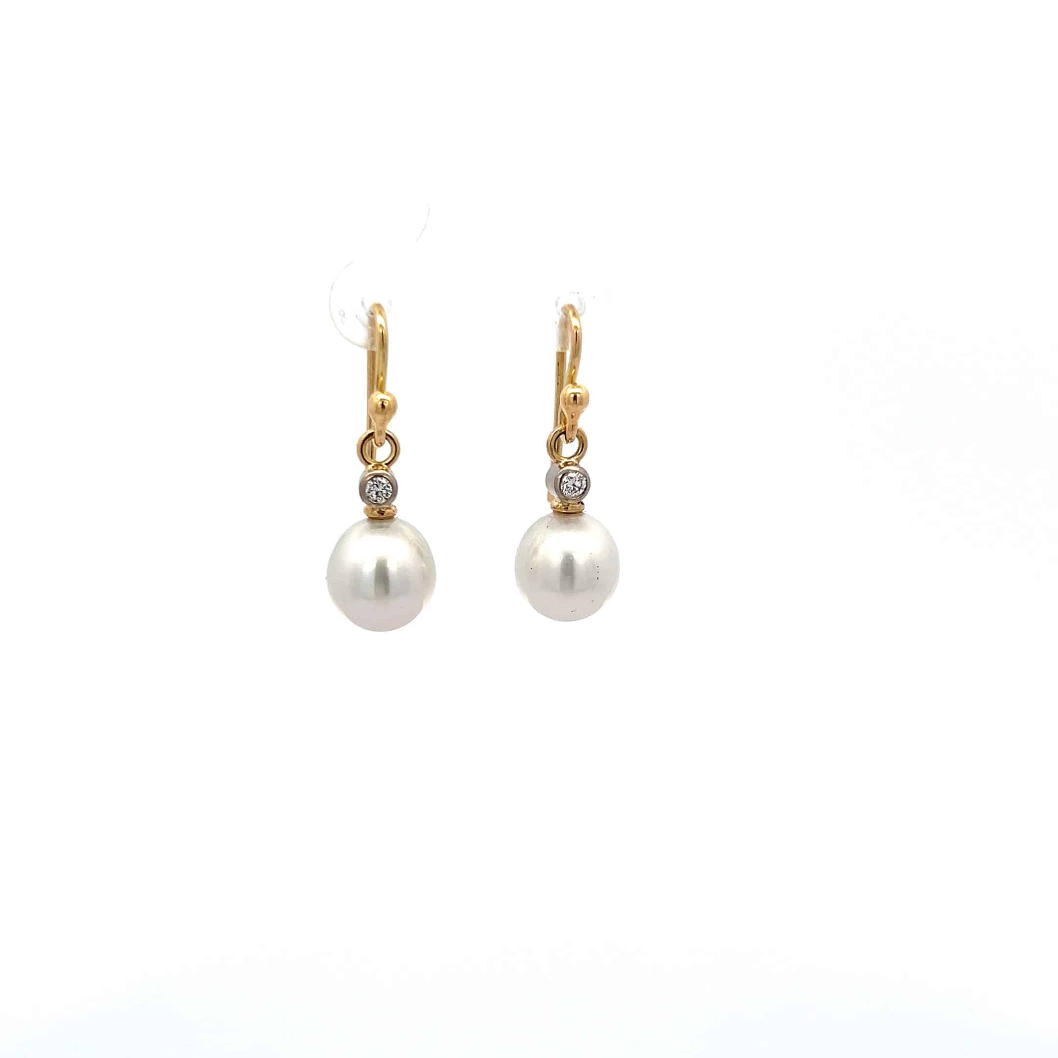 - Ohrringe aus 18 Karat Gelbgold mit Südseezuchtperlen mit einem Durchmesser von 9 bis 10 mm und Brillanten fw/vs2, zus. 0,10 ct., 2,5 mm Durchmesser.